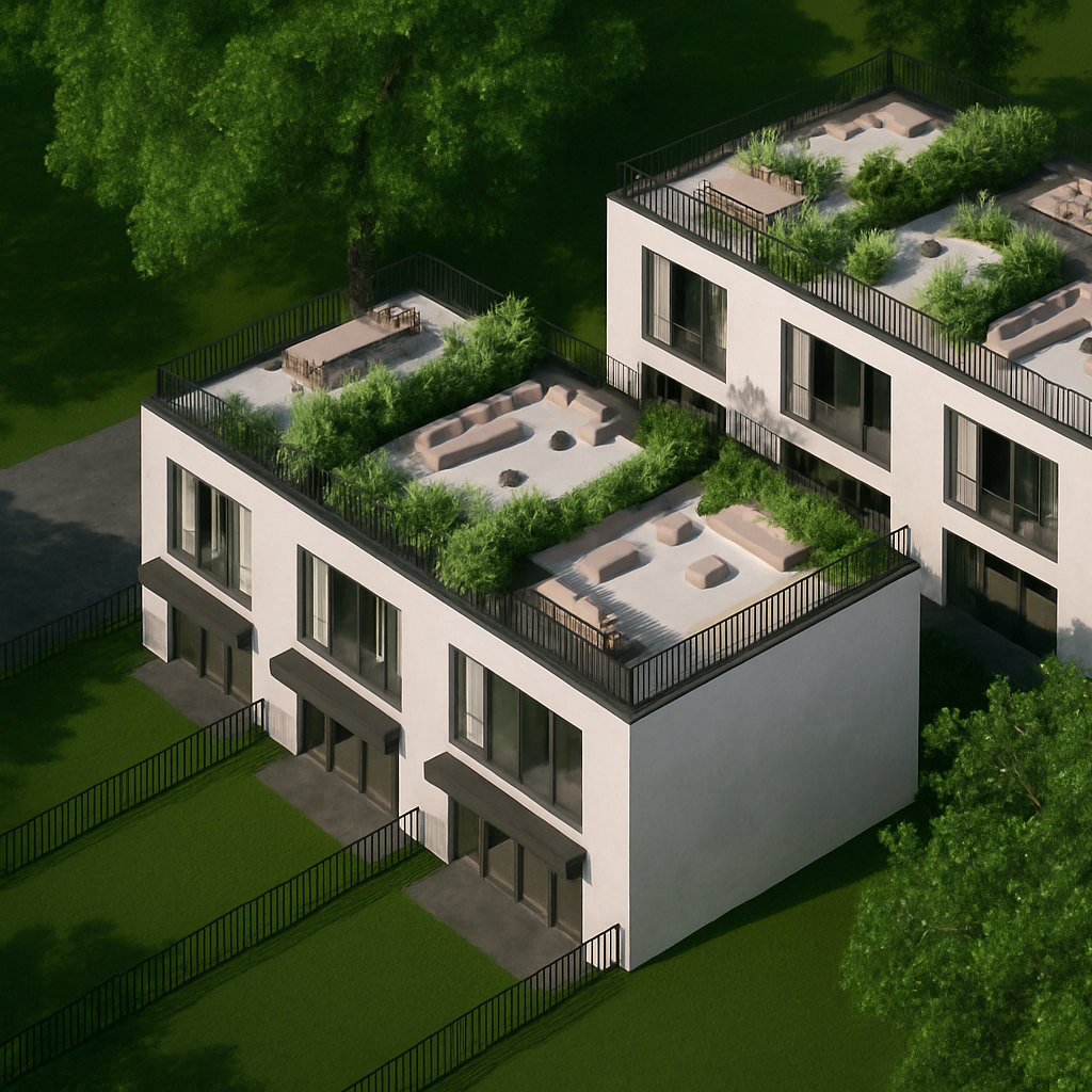 • 6 lokali mieszkalnych na parterze, o powierzchni całkowitej 63,32 m2 z balkonem i tarasem 30 m2 na dachu – typ II