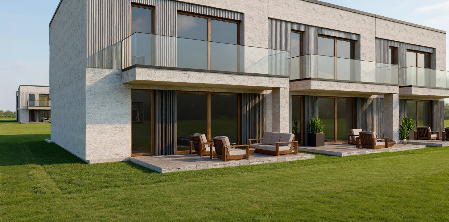 Estetyczne szklane balustrady i detale z betonu architektonicznego.